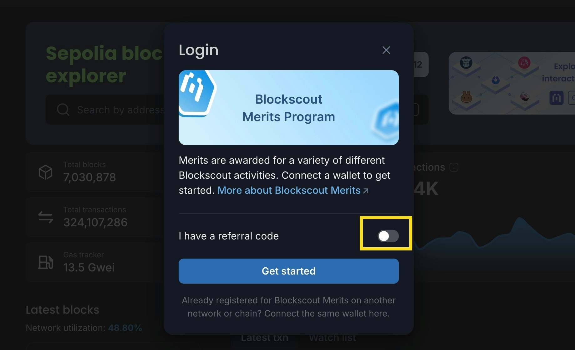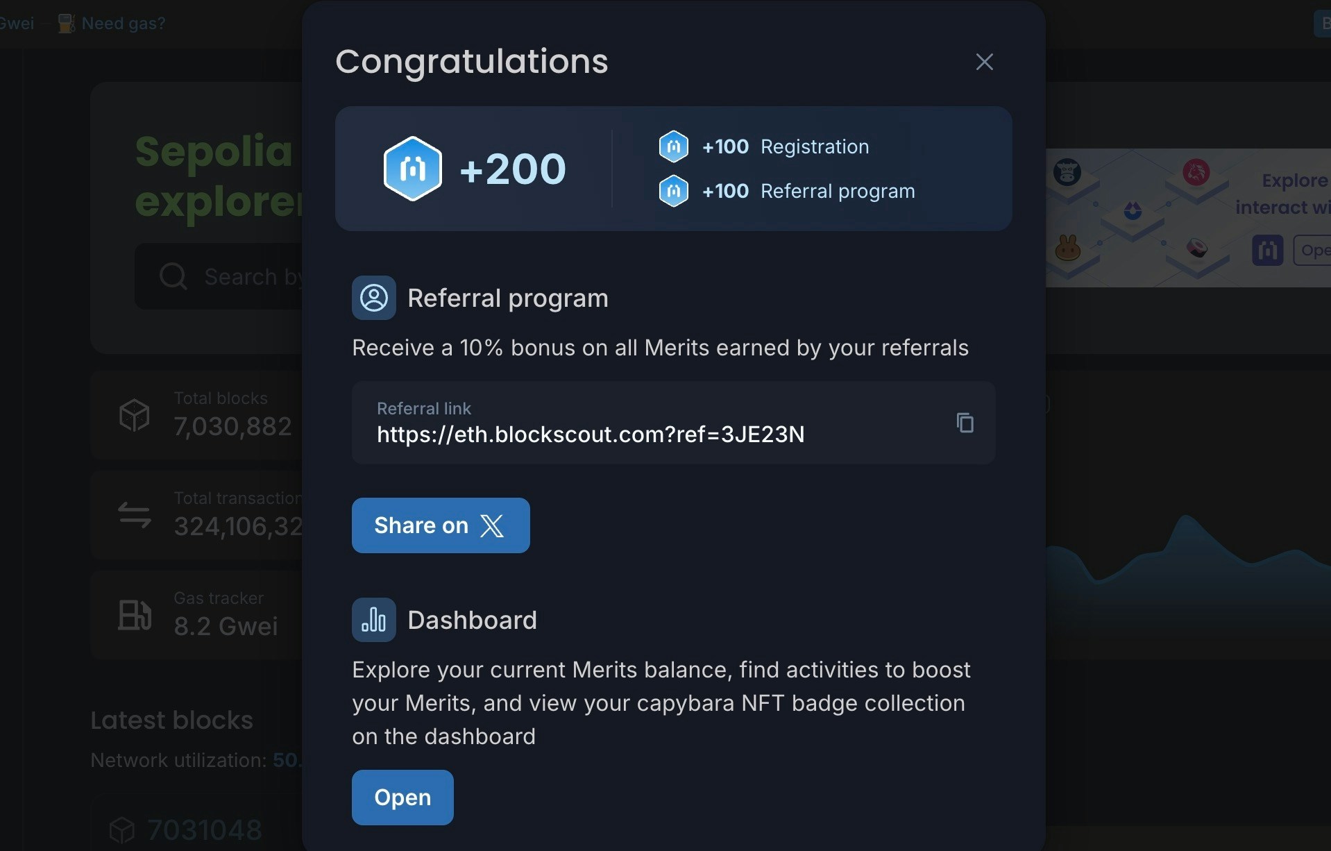 If you already have a Blockscout account, you can still use a referral code to sign up for the Merits program. Login to your Blockscout account and paste in the referral link or press the Merits button to start. Follow the process above starting with step 5.