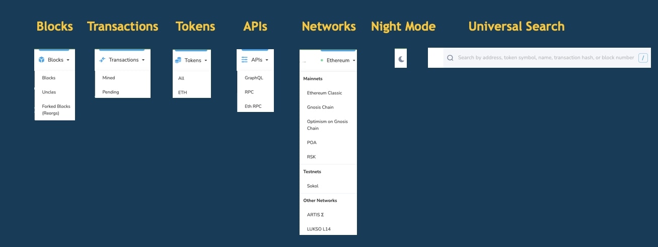 Many projects still use the previous Blockscout UI, and info below relates to the previous v1 UI. We encourage projects to upgrade to the new UI.Top Menu
