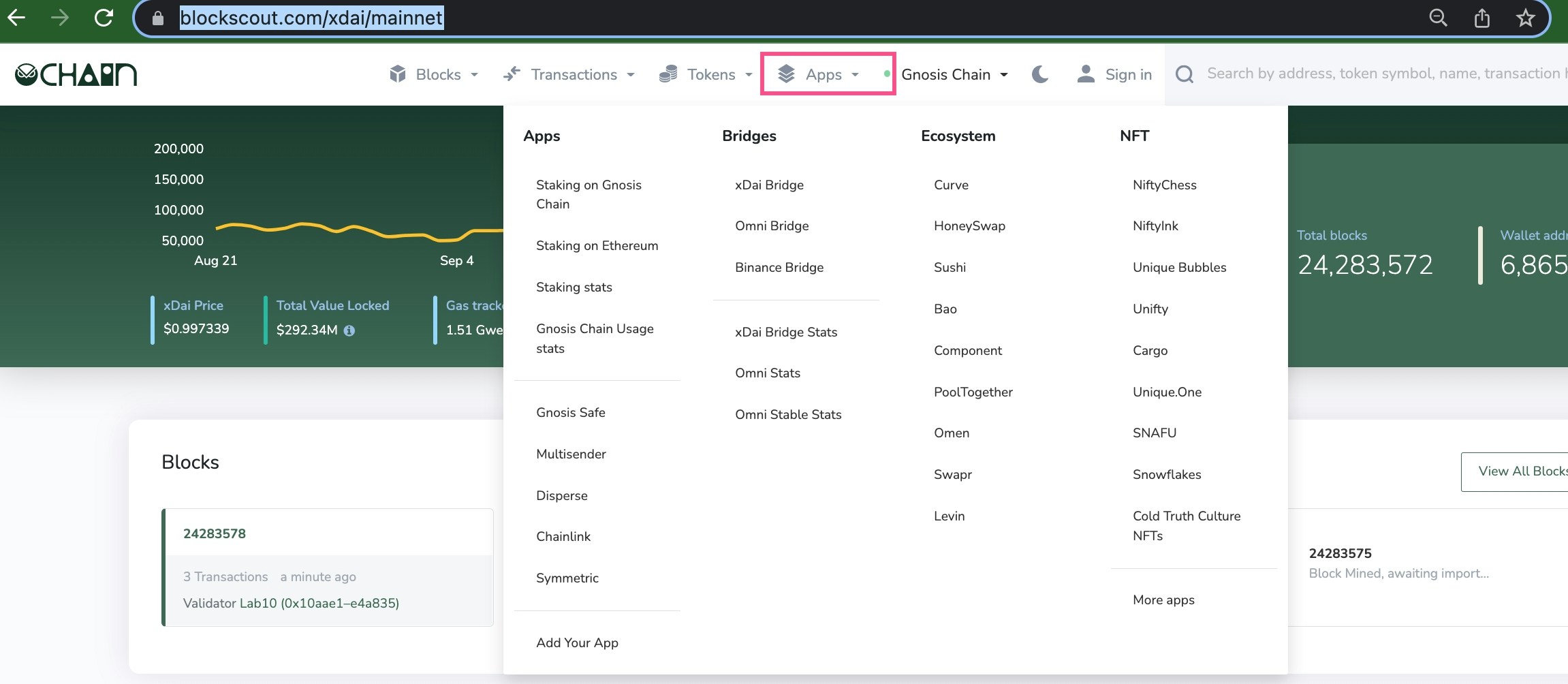 The top menu contains navigational items for exploration. The menu is customizable, and different instances can have different menus depending on the needs of the chain.
